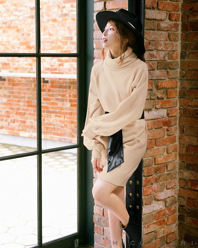サイドスリットや裾に施されたフリンジなど、細部にこだわりが詰まったトレンド感満載のニットワンピ。くみっきーは潔く1枚で着こなしています。シンプルだけど手抜きに見えないのは、シルエットがきれいなワンピをチョイスしているから! 誰でもマネしやすいおすすめのコーデ♪