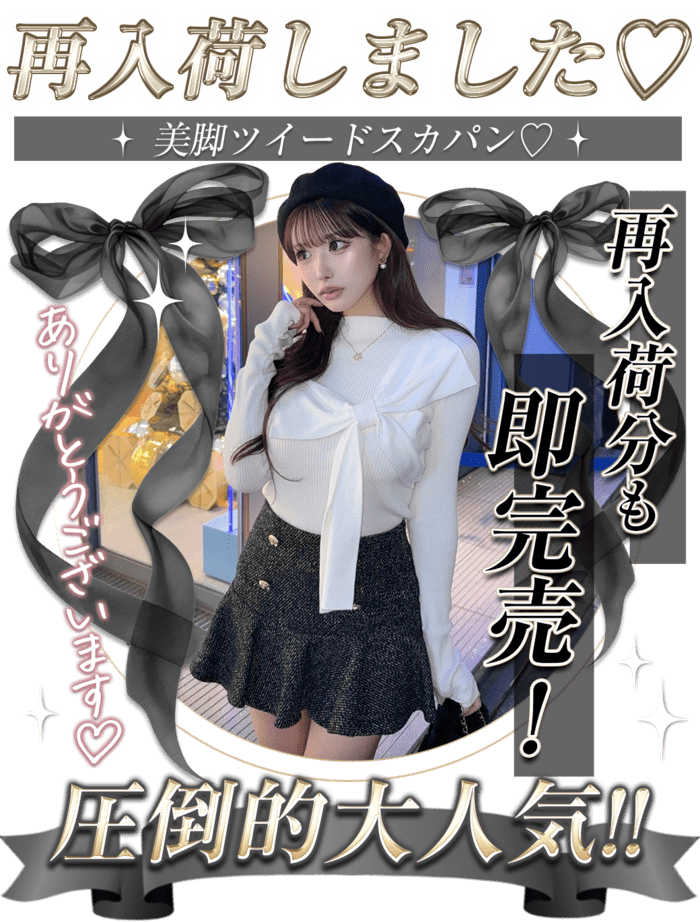 11/7UP♥ TOPS ONEPIECE BOTTOMS SETUP SKIRT OUTER SHOES BAG 11/7(Fri) New ファートレンチワンピコート New ファートレンチワンピコート New ムートンジャケット New ムートンジャケット New ハイウエストツイードショートパンツ 11/6(Thu) New / ReArrival / Soldout ケーブルアンサンブルワンピース 残りわずか ケーブルアンサンブルワンピース New ファーショートファイバーダウン New ファーショートファイバーダウン New プードルファーコート New プードルファーコート New レースクラッシュデニム 11/5(Wed) New / ReArrival ツイード美脚スカパン New くびれリボンファイバーダウン New くびれリボンファイバーダウン New クラシカルチェックセットアップ New クラシカルチェックセットアップ 11/4(Tue) New ケープコートセットアップ New ケープコートセットアップ New リボンレースセットアップ New ケーブルニットマフラーアンサンブル New ケーブルニットマフラーアンサンブル 10/28(Tue) New 厚底チェルシーブーツ New / ReArrival ダブルボタン美脚スカパン No.1 New / 残りわずか フレアパンツセットアップ No.2 厚底スエードニーハイブーツ No.3 バイカラーシャギーラインカーディガン No.4 New ケープコートセットアップ No.5 New 肩あきアンサンブルマキシワンピース No.6 ReArrival ダブルボタン美脚スカパン New ビッグリボントップス New / ReArrival ツイード美脚スカパン 厚底スエードニーハイブーツ New / Soldout ビッグリボントップス 美脚ハイウエストショートパンツ New ポイントロゴ厚底ローファー ベロアフレアセットアップ ベロアフレアセットアップ ベロアフレアセットアップ Request ファーコート Request ビッグチェックトレンチファーコート Request ビッグチェックトレンチファーコート Request ビジューファーショートコート Request ビジューファーショートコート Request ビジューファーショートコート ReArrival ダブルボタン美脚スカパン New / ReArrival ダブルボタン美脚スカパン ダブルボタン美脚スカパン ReArrival 美脚ストレッチフレアパンツ ReArrival ハイウエスト美脚スキニーパンツ ReArrival 美脚スキニーパンツ ReArrival / 残りわずか ハイウエストスキニーデニム 残り2点 美脚セットアップ New オフショルローゲージニットトップス New オフショルケープニットトップス ビッグリボンブラウス パフスリーブパールワンピース ケープリボンミニワンピース ラインワンピースアンサンブル ReArrival ハイウエスト美脚スキニーパンツ ReArrival 美脚ストレッチフレアパンツ 美脚ストレッチフレアデニム ReArrival ダブルボタン美脚スカパン New / ReArrival ダブルボタン美脚スカパン ラメプリーツスカート(インナーパンツ付)