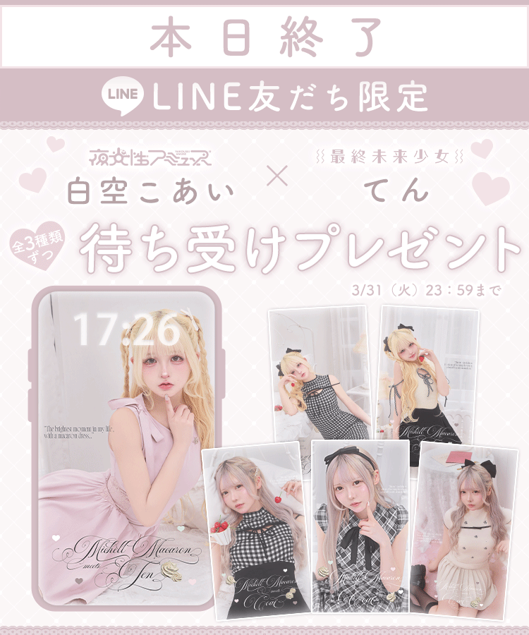 Official SNS Twitter Instagram メールマガジン LINE@ News 新作アイテム 発売前アイテム Information ブランドコンセプト フリーサイズ展開スタート♥ Category ワンピース アウター/ジャケット サロペット/コンビネゾン スカート トップス カーディガン セットアップ ボトムス シューズ バッグ ファッショングッズ ALLアイテム Hours : Minutes : Seconds : Milli 総合 ワンピース トップス セットアップ ボトムス シューズ 前回1日で即完売…!!大人気トップスが再入荷しました♡ 2026.3.6 大人気の即完アイテム♡フロントリボンチェックミニワンピが再入荷!! 2026.3.6 \毎年大人気♡/盛れるサンダルが再入荷しました♡ 2026.2.24