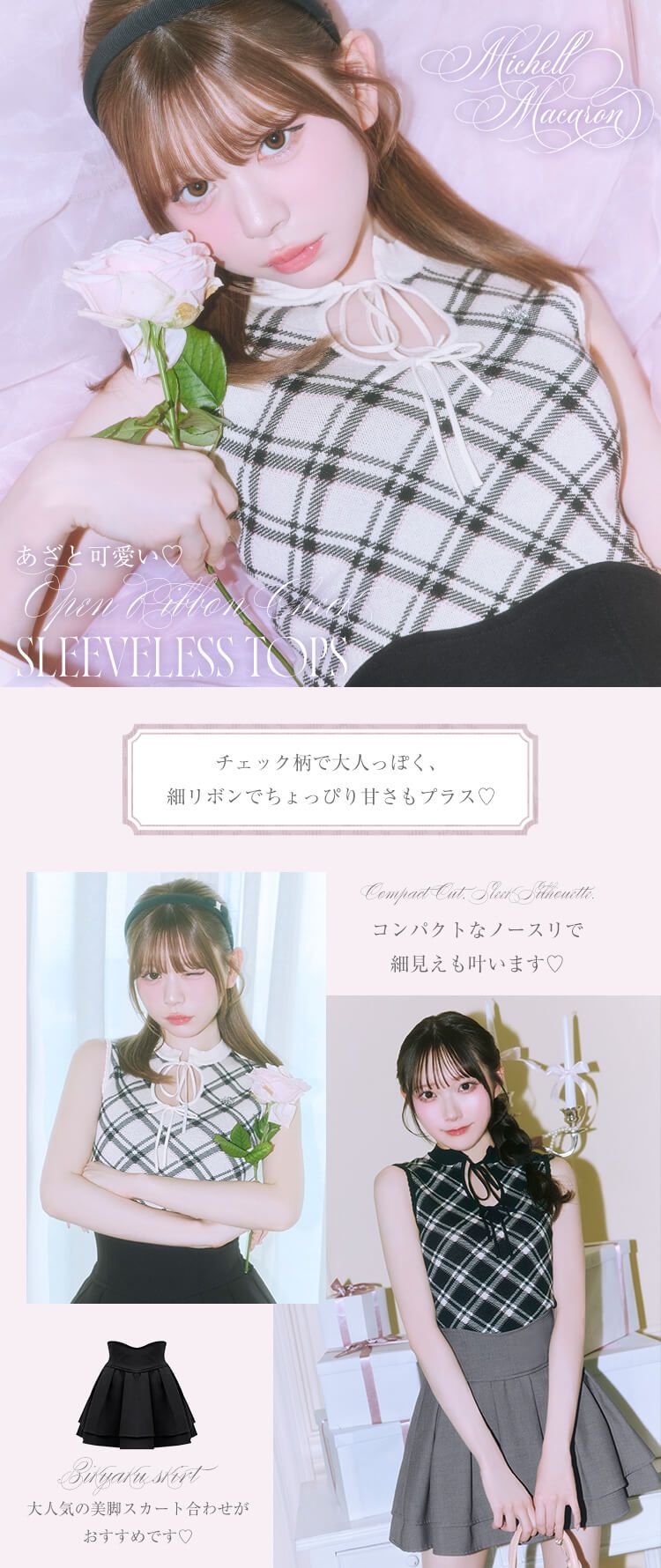 Official SNS Twitter Instagram メールマガジン LINE@ News 新作アイテム 発売前アイテム Information ブランドコンセプト フリーサイズ展開スタート♥ Category ワンピース アウター/ジャケット サロペット/コンビネゾン スカート トップス カーディガン セットアップ ボトムス シューズ バッグ ファッショングッズ ALLアイテム michellMacaron SJJ0391C_オープンリボンチェックノースリトップス SJJ0391C_オープンリボンチェックノースリトップス 2026.03.03