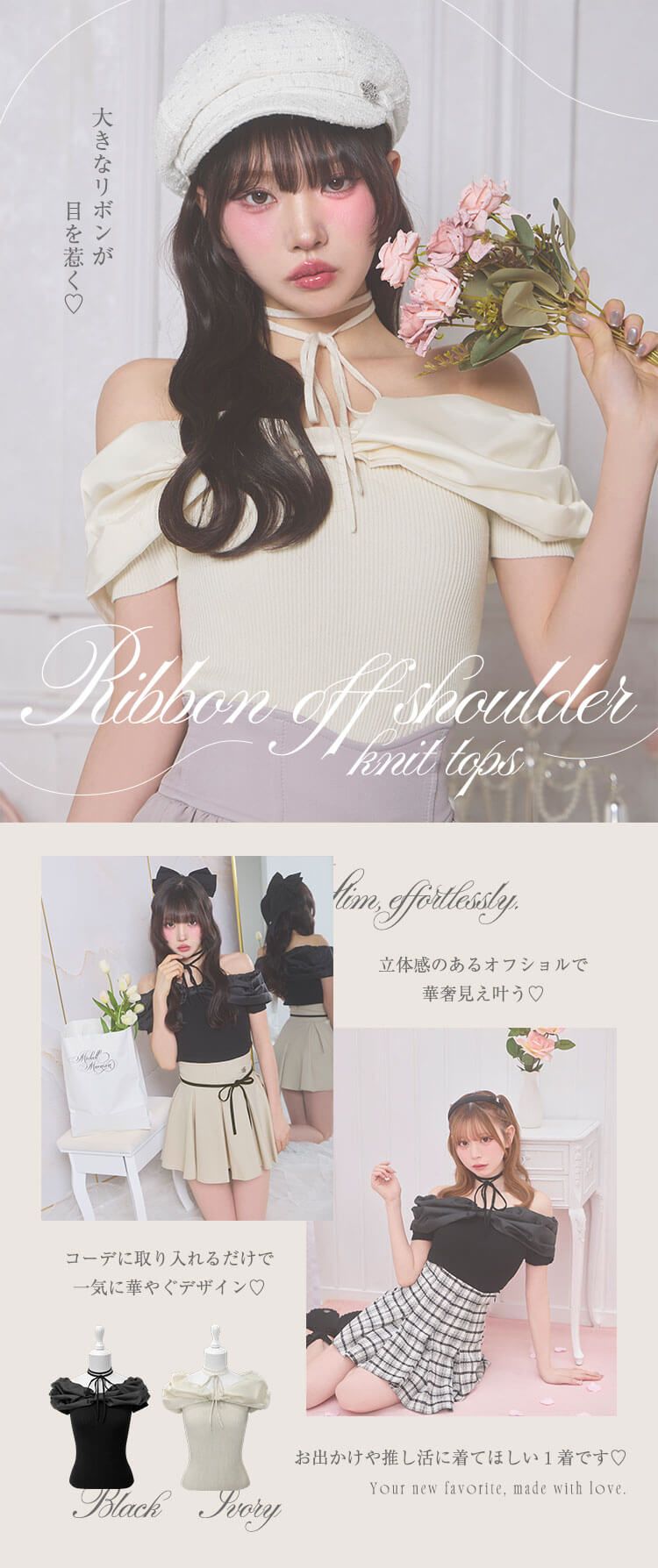 Official SNS Twitter Instagram メールマガジン LINE@ News 新作アイテム 発売前アイテム Information ブランドコンセプト フリーサイズ展開スタート♥ Category ワンピース アウター/ジャケット サロペット/コンビネゾン スカート トップス カーディガン セットアップ ボトムス シューズ バッグ ファッショングッズ ALLアイテム michellMacaron SJJ0420C_リボンオフショルニットトップス SJJ0420C_リボンオフショルニットトップス 2026.04.08