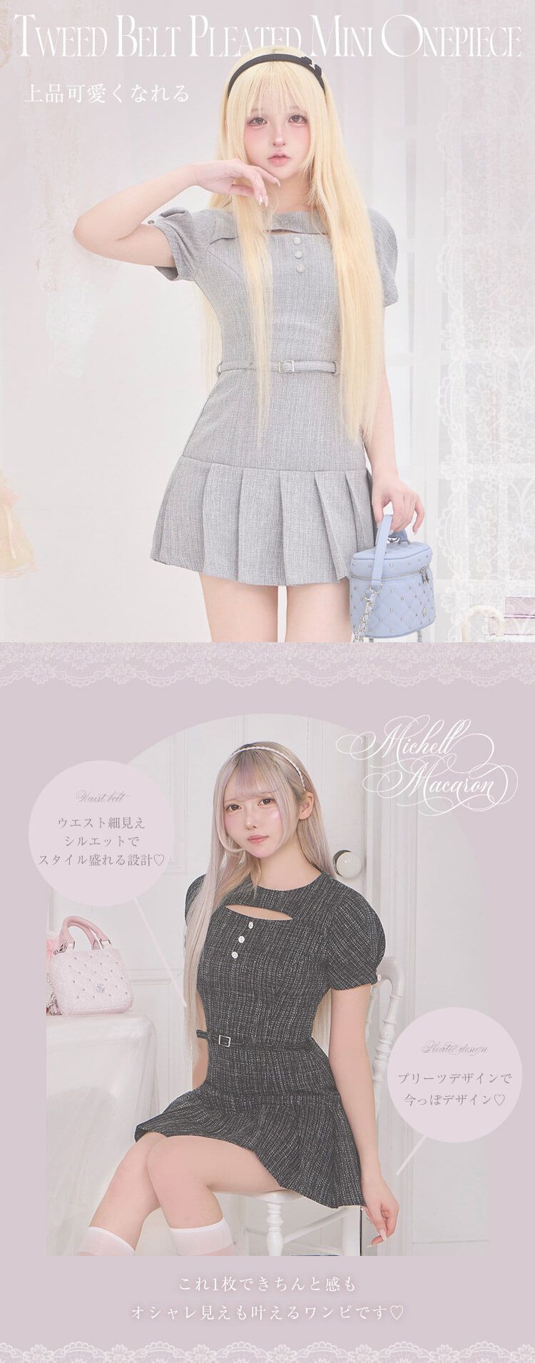 Official SNS Twitter Instagram メールマガジン LINE@ News 新作アイテム 発売前アイテム Information ブランドコンセプト フリーサイズ展開スタート♥ Category ワンピース アウター/ジャケット サロペット/コンビネゾン スカート トップス カーディガン セットアップ ボトムス シューズ バッグ ファッショングッズ ALLアイテム michellMacaron SCI0016_ツイードベルトプリーツミニワンピ SCI0016_ツイードベルトプリーツミニワンピ 2026.04.09