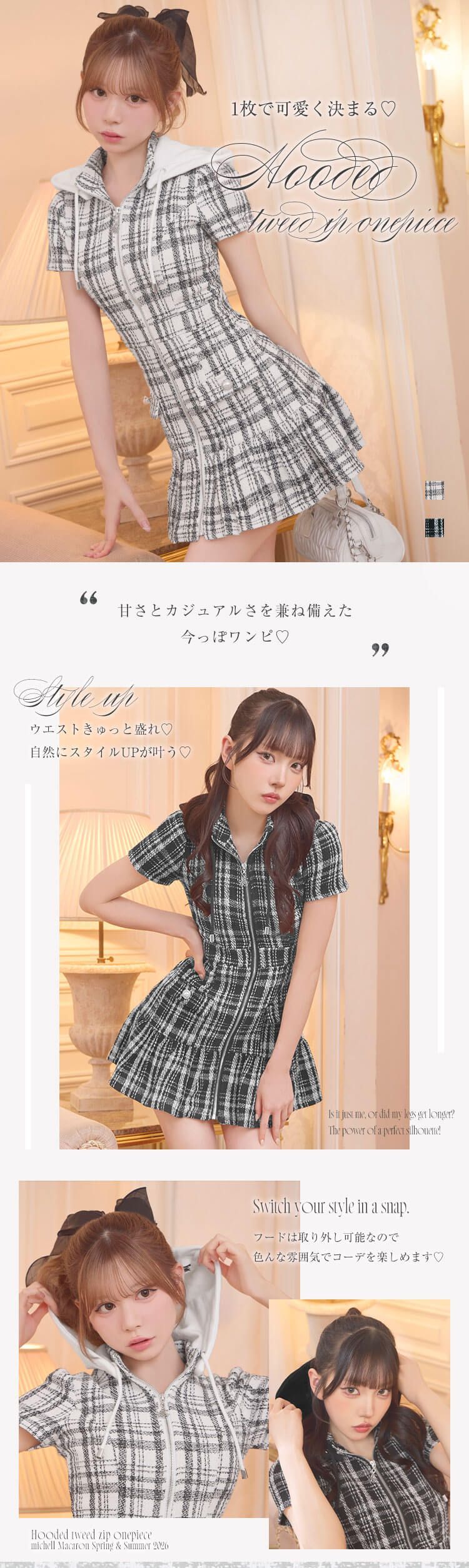 Official SNS Twitter Instagram メールマガジン LINE@ News 新作アイテム 発売前アイテム Information ブランドコンセプト フリーサイズ展開スタート♥ Category ワンピース アウター/ジャケット サロペット/コンビネゾン スカート トップス カーディガン セットアップ ボトムス シューズ バッグ ファッショングッズ ALLアイテム michellMacaron SFP0383C_フード付きツイードジップワンピース SFP0383C_フード付きツイードジップワンピース 2026.03.16