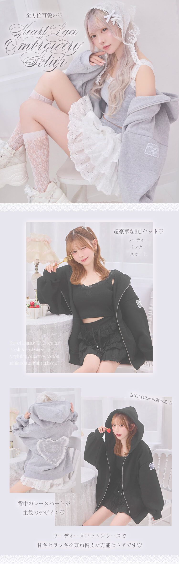 Official SNS Twitter Instagram メールマガジン LINE@ News 新作アイテム 発売前アイテム Information ブランドコンセプト フリーサイズ展開スタート♥ Category ワンピース アウター/ジャケット サロペット/コンビネゾン スカート トップス カーディガン セットアップ ボトムス シューズ バッグ ファッショングッズ ALLアイテム michellMacaron SJU0021_ハートレース刺繍3点セットアップ SJU0021_ハートレース刺繍3点セットアップ 2026.03.27