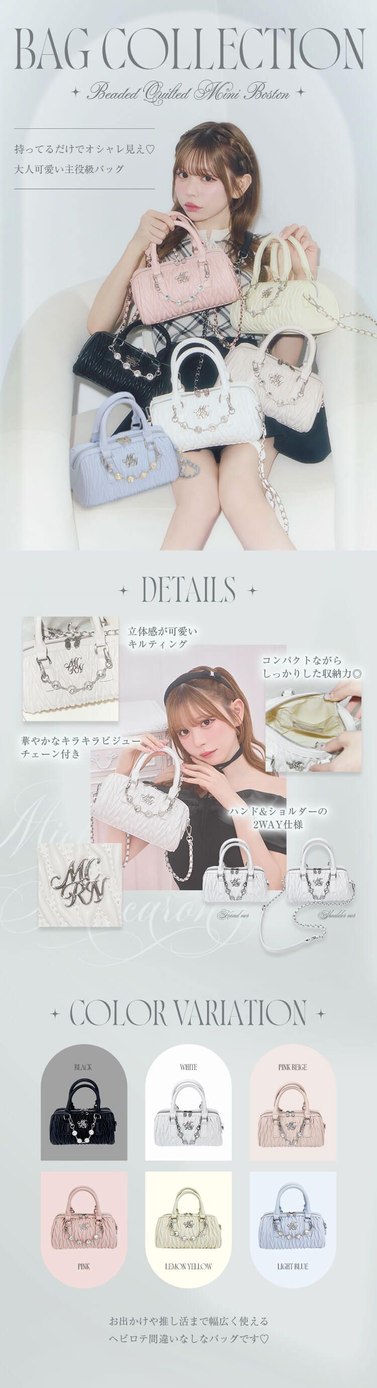 Official SNS Twitter Instagram メールマガジン LINE@ News 新作アイテム 発売前アイテム Information ブランドコンセプト フリーサイズ展開スタート♥ Category ワンピース アウター/ジャケット サロペット/コンビネゾン スカート トップス カーディガン セットアップ ボトムス シューズ バッグ ファッショングッズ ALLアイテム michellMacaron SFO0025_ビジューキルティングミニボストン SFO0025_ビジューキルティングミニボストン 2026.03.27