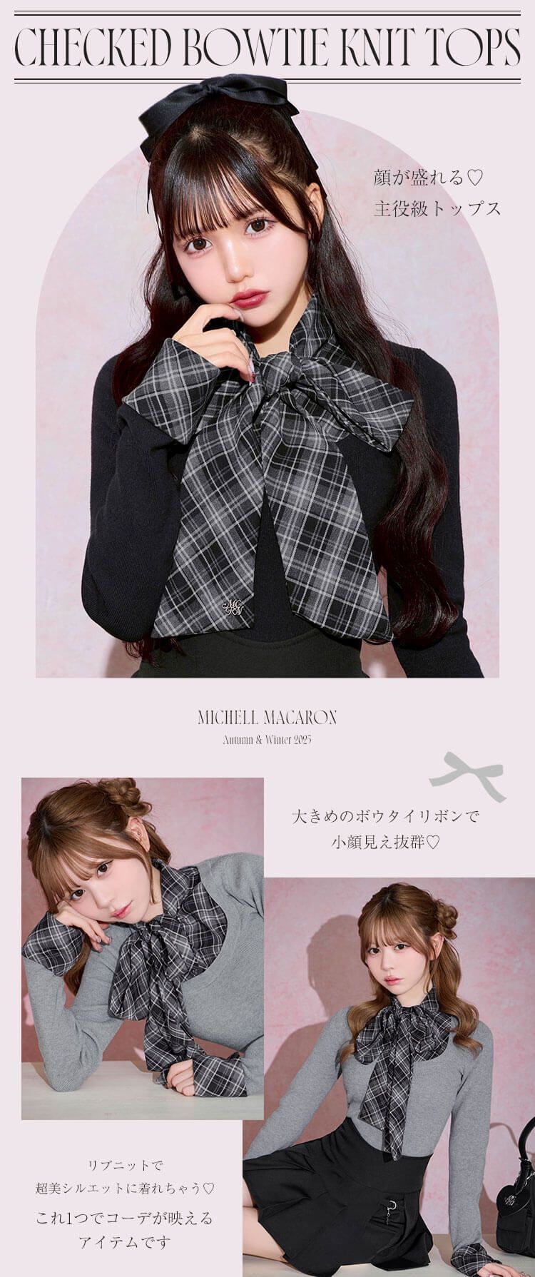 Official SNS Twitter Instagram メールマガジン LINE@ News 新作アイテム 発売前アイテム Information ブランドコンセプト フリーサイズ展開スタート♥ Category ワンピース アウター/ジャケット サロペット/コンビネゾン スカート トップス カーディガン セットアップ ボトムス シューズ バッグ ファッショングッズ ALLアイテム michellMacaron SJJ0334C_チェックボウタイニットトップス SJJ0334C_チェックボウタイニットトップス 2025.10.08