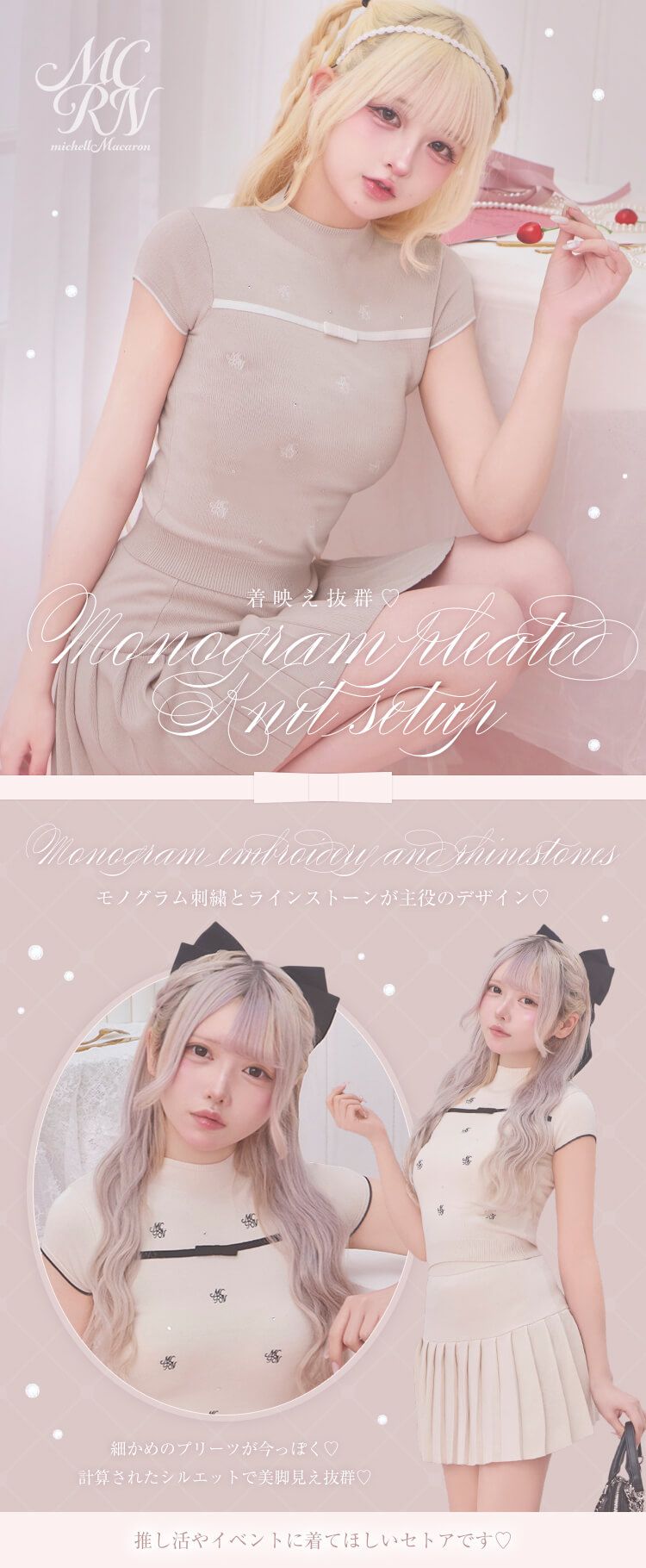 Official SNS Twitter Instagram メールマガジン LINE@ News 新作アイテム 発売前アイテム Information ブランドコンセプト フリーサイズ展開スタート♥ Category ワンピース アウター/ジャケット サロペット/コンビネゾン スカート トップス カーディガン セットアップ ボトムス シューズ バッグ ファッショングッズ ALLアイテム michellMacaron SJJ0437C_モノグラムプリーツニットセットアップ SJJ0437C_モノグラムプリーツニットセットアップ 2026.04.02