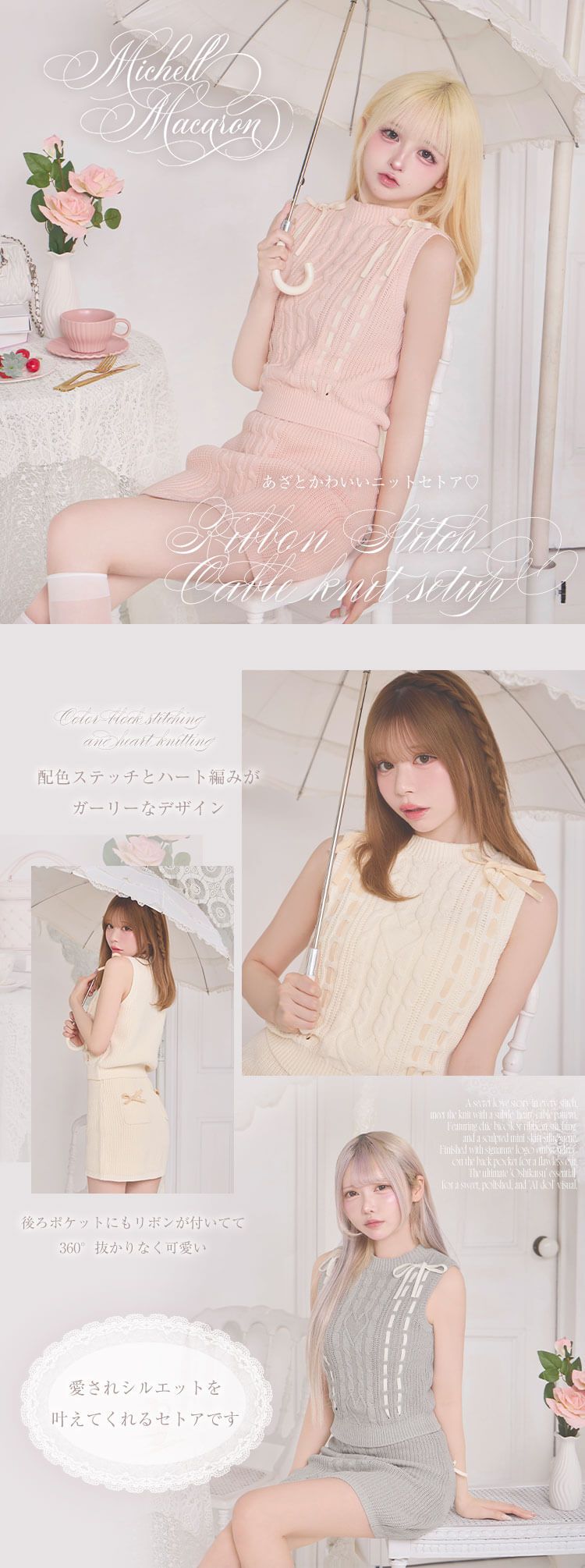 Official SNS Twitter Instagram メールマガジン LINE@ News 新作アイテム 発売前アイテム Information ブランドコンセプト フリーサイズ展開スタート♥ Category ワンピース アウター/ジャケット サロペット/コンビネゾン スカート トップス カーディガン セットアップ ボトムス シューズ バッグ ファッショングッズ ALLアイテム michellMacaron SFY0534XC_リボンステッチケーブルニットセットアップ SFY0534XC_リボンステッチケーブルニットセットアップ 2026.04.16