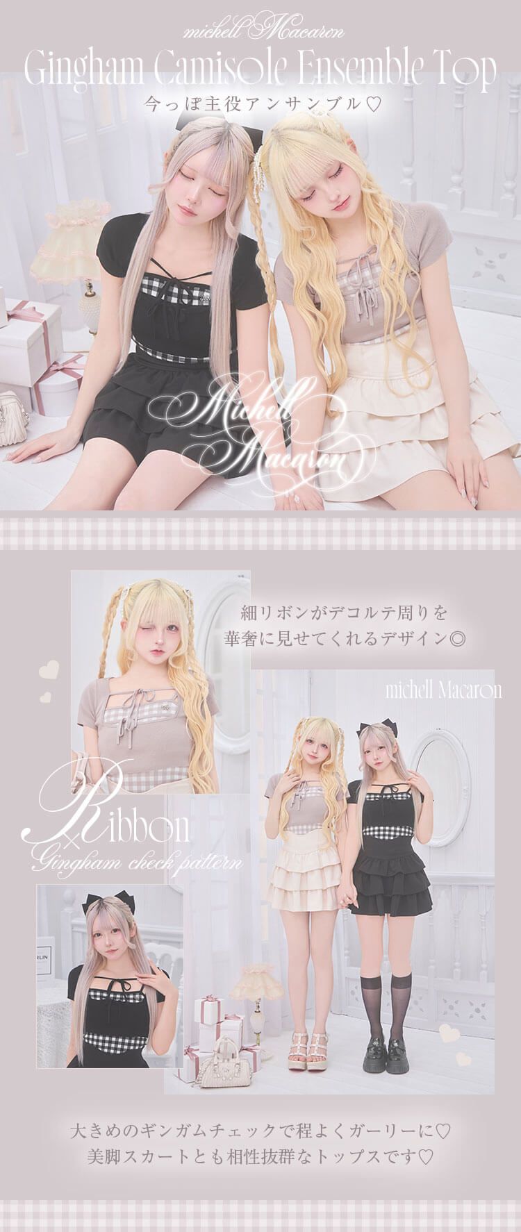 Official SNS Twitter Instagram メールマガジン LINE@ News 新作アイテム 発売前アイテム Information ブランドコンセプト フリーサイズ展開スタート♥ Category ワンピース アウター/ジャケット サロペット/コンビネゾン スカート トップス カーディガン セットアップ ボトムス シューズ バッグ ファッショングッズ ALLアイテム michellMacaron SJJ0426C_ギンガムキャミアンサンブルトップス SJJ0426C_ギンガムキャミアンサンブルトップス 2026.04.06