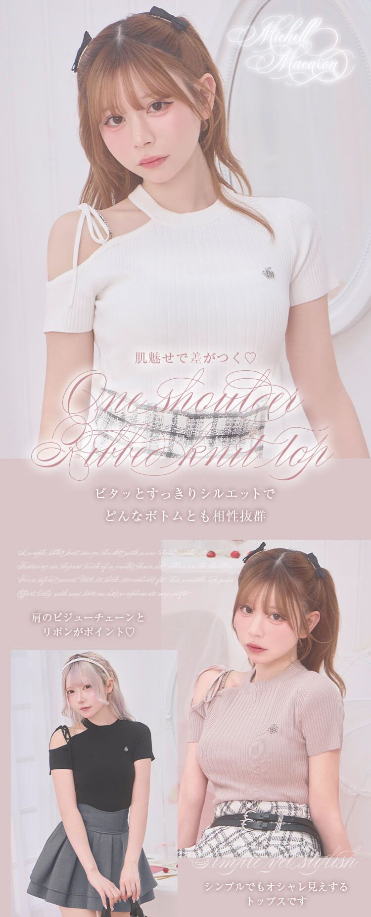 ・リブニットのシンプルなデザインにワンショルダーの抜け感と肩のビジューチェーン&リボンを添えた上品アクセントが魅力♪