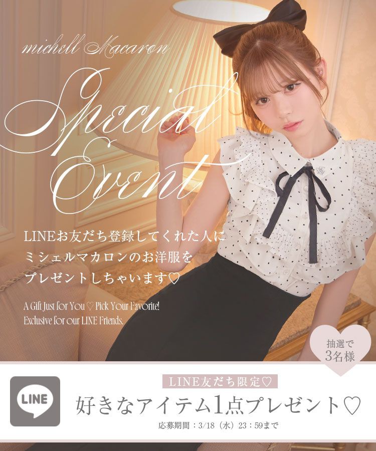 Official SNS Twitter Instagram メールマガジン LINE@ News 新作アイテム 発売前アイテム Information ブランドコンセプト フリーサイズ展開スタート♥ Category ワンピース アウター/ジャケット サロペット/コンビネゾン スカート トップス カーディガン セットアップ ボトムス シューズ バッグ ファッショングッズ ALLアイテム Hours : Minutes : Seconds : Milli 総合 ワンピース トップス セットアップ ボトムス シューズ 前回1日で即完売…!!大人気トップスが再入荷しました♡ 2026.3.6 大人気の即完アイテム♡フロントリボンチェックミニワンピが再入荷!! 2026.3.6 \毎年大人気♡/盛れるサンダルが再入荷しました♡ 2026.2.24