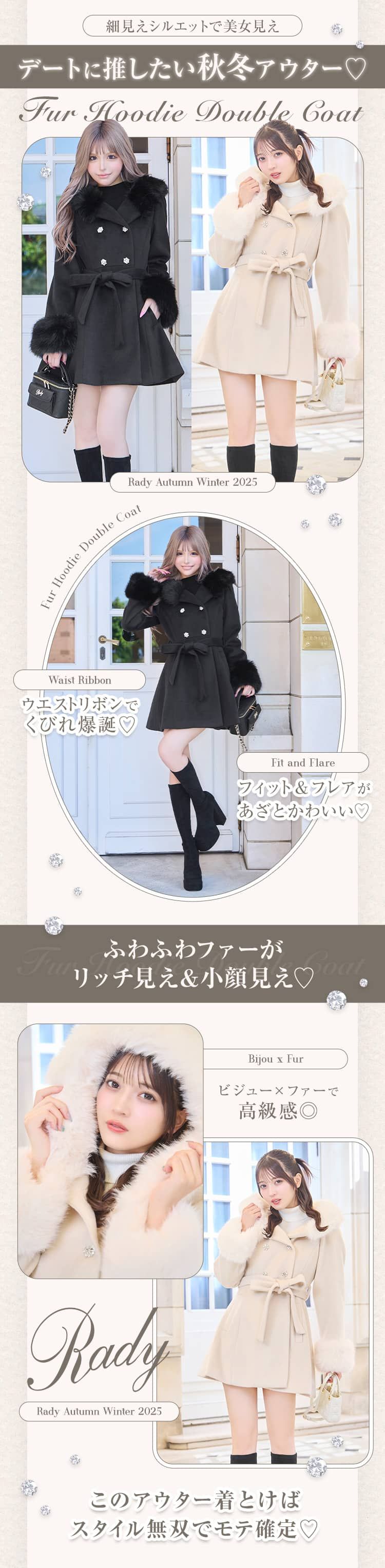Category アウター トップス ワンピース ボトムス/スカート セットアップ シューズ バッグ インテリア コスメ ファッショングッズ ALLアイテム ・ ロゴデザイン不正使用による逮捕事例 ・ 地震の影響による一部地域配送遅延について Rady KB0096ファーフーディダブルコート KB0096ファーフーディダブルコート 2025.10.31