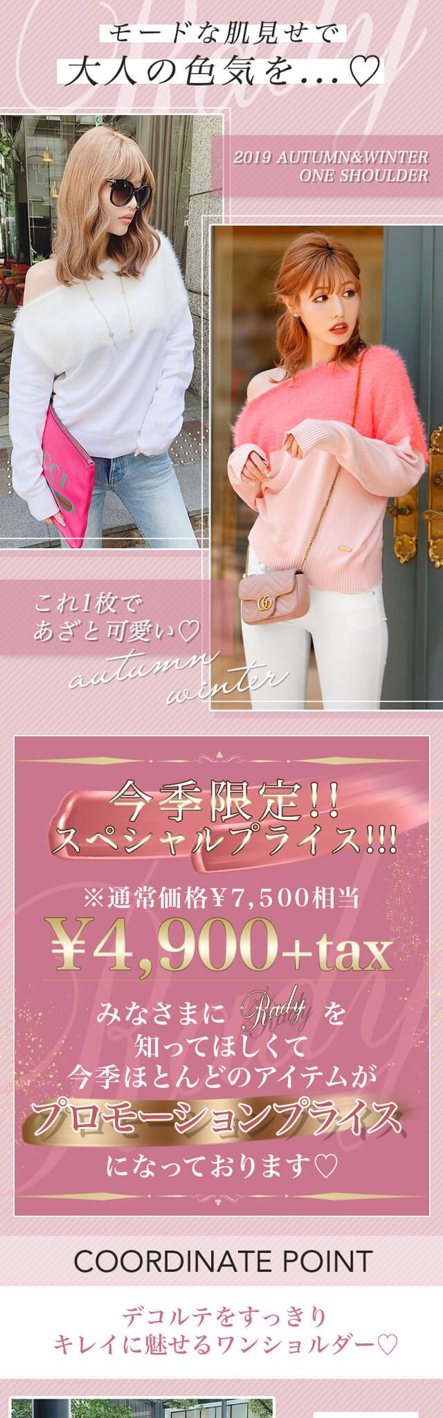 Category アウター トップス ワンピース ボトムス/スカート セットアップ シューズ バッグ インテリア コスメ ファッショングッズ ALLアイテム ・ ロゴデザイン不正使用による逮捕事例 ・ 地震の影響による一部地域配送遅延について Rady ワンショルダーニットトップス ワンショルダーニットトップス 2019.09.18