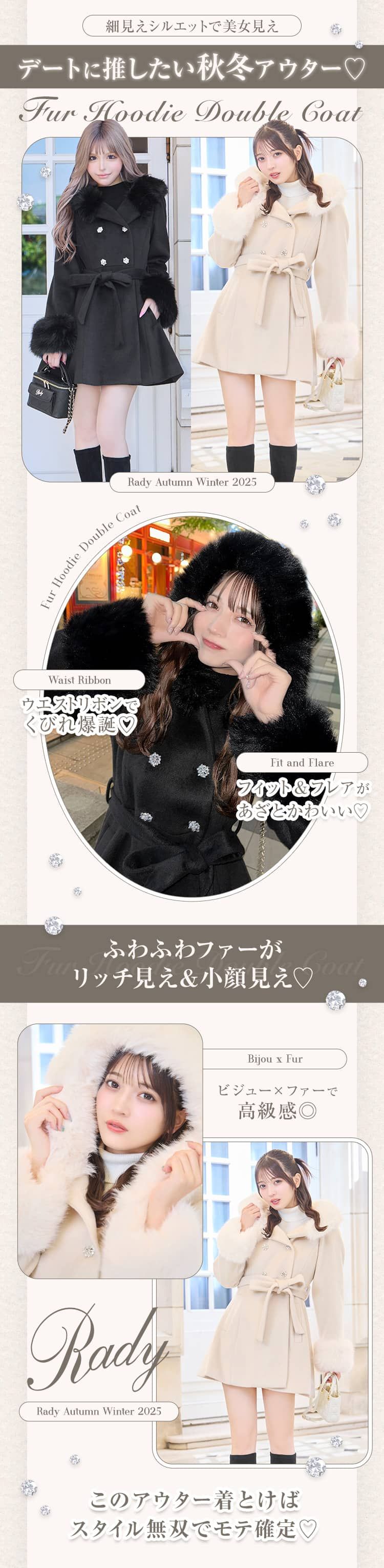 Category アウター トップス ワンピース ボトムス/スカート セットアップ シューズ バッグ インテリア コスメ ファッショングッズ ALLアイテム ・ ノベルティ期間中のご注文について ・ ロゴデザイン不正使用による逮捕事例 ・ 地震の影響による一部地域配送遅延について Rady KB0096ファーフーディダブルコート KB0096ファーフーディダブルコート 2025.11.18