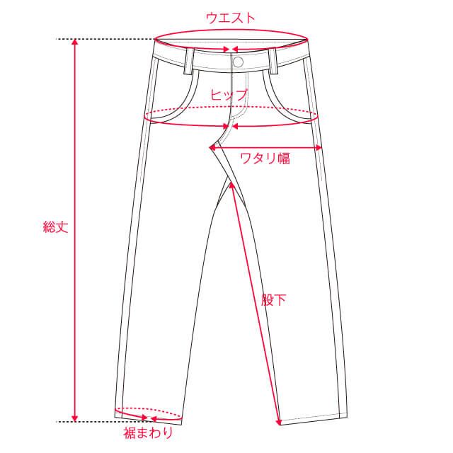 ![]()  | 【ボトムス】 ■ウエスト 前側と後側の上端を合わせて水平に測って2倍にした長さ ■ヒップ ウエストから約20cmほど下がったところを直線で測って2倍にした長さ ■総丈 上端から裾までを縫い目に沿っての直線 ■股上 股合わせ部分からウエストライン(上端)までの長さ ■股下 パンツの脇の縫い目から裾(足首)まで、内股の縫い目に沿って測った長さ ■わたり 股のつけね部分の横幅の長さ ■裾まわり 裾の1番下を直線に測って2倍にした長さ  |
